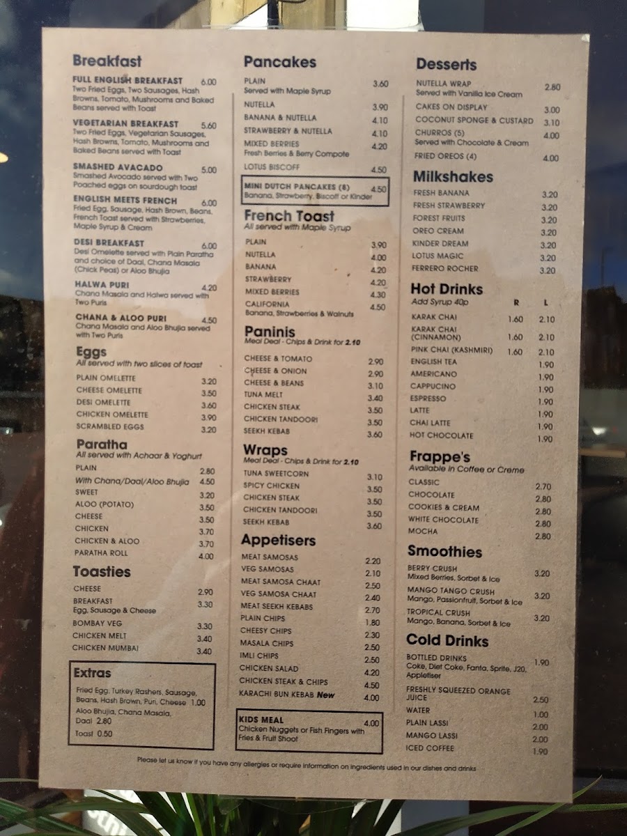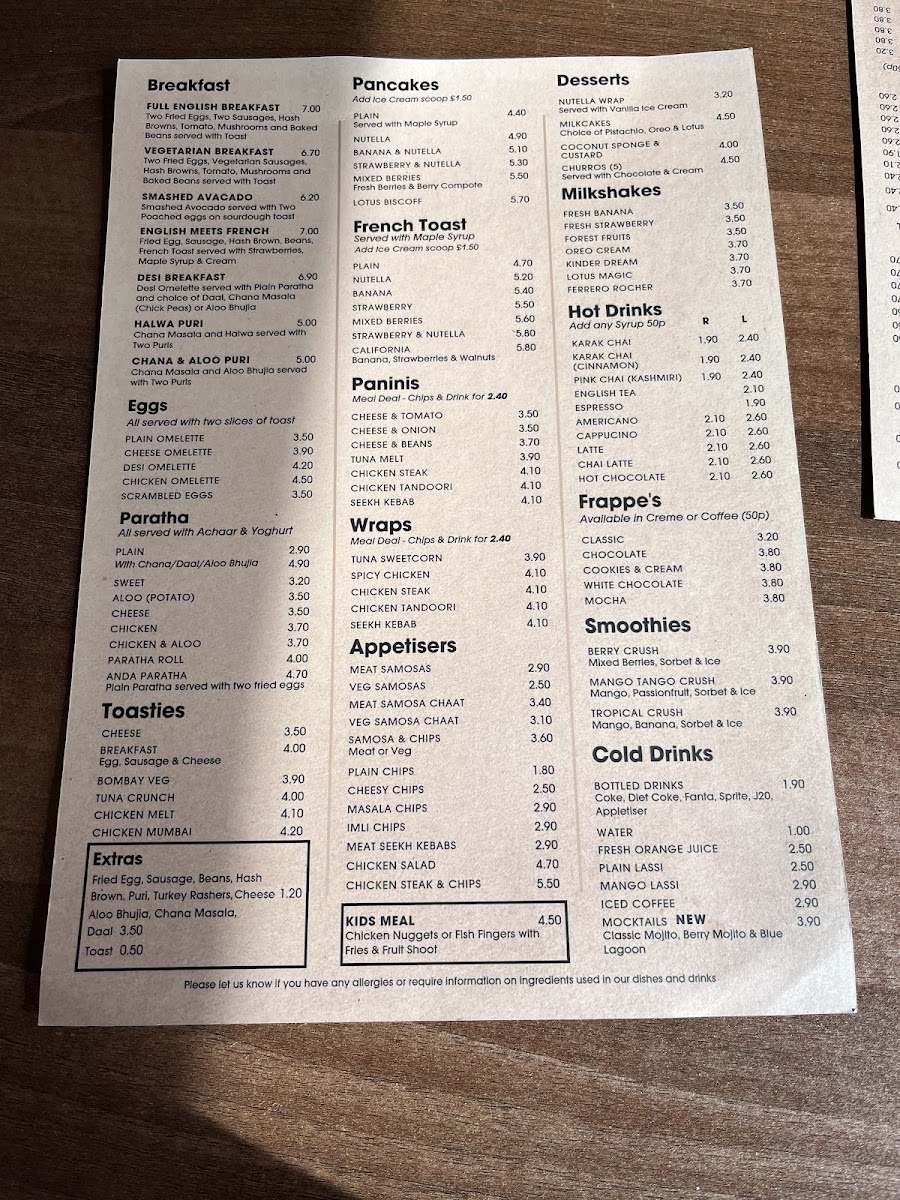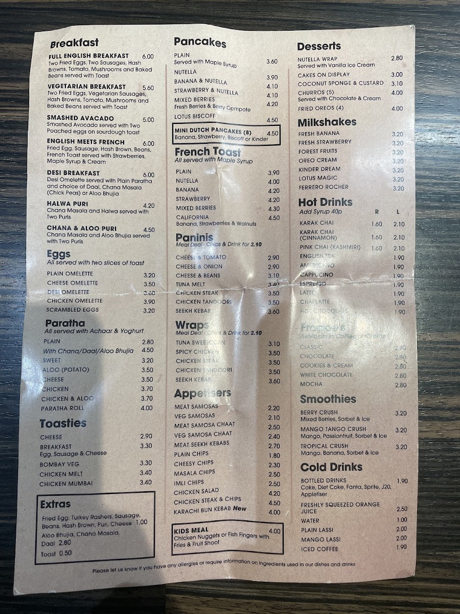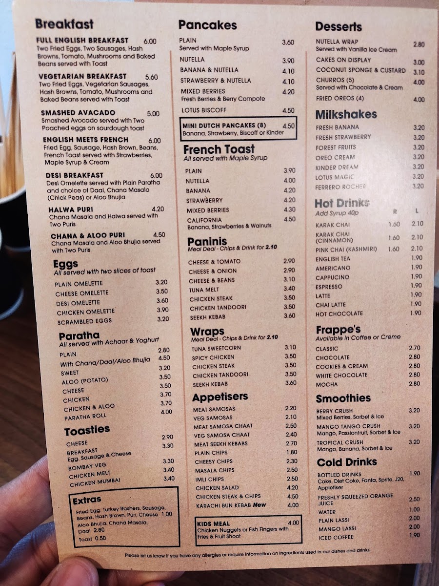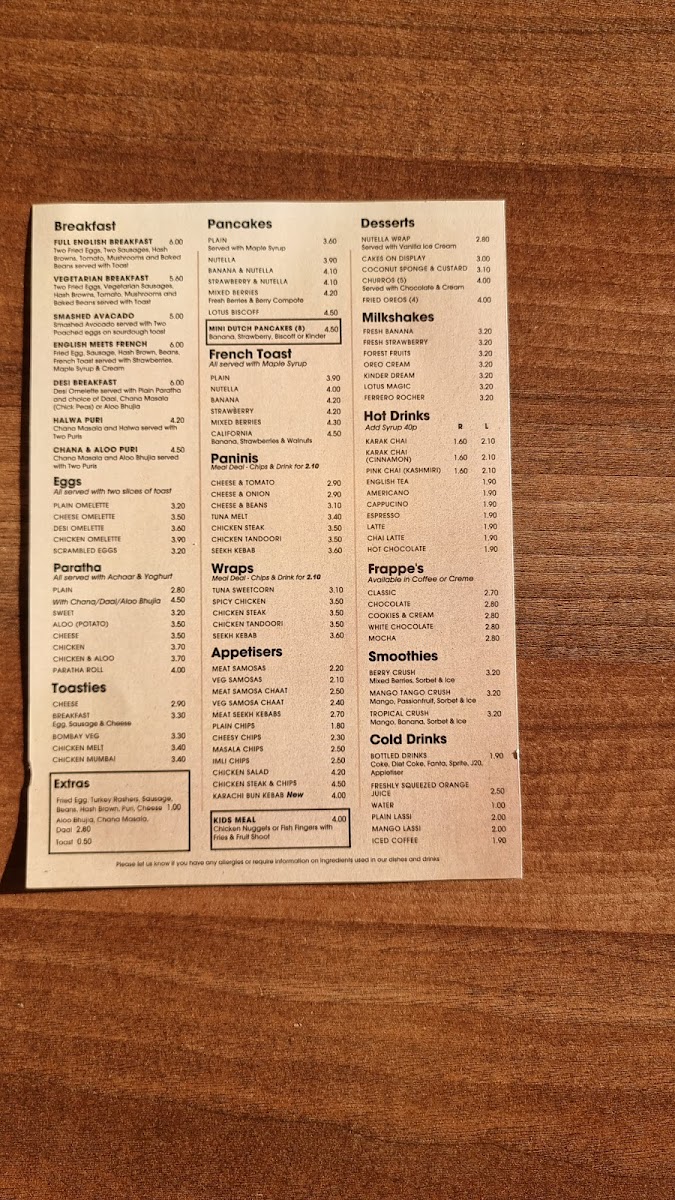 The menu boasts a variety of tantalizing options, from classic Anda Paratha (£5.50) to unique twists like the Cheese Paratha (£4.20). You can also indulge in their delectable Paratha Rolls (£4.50) and sweet delights for a hearty start to your day.